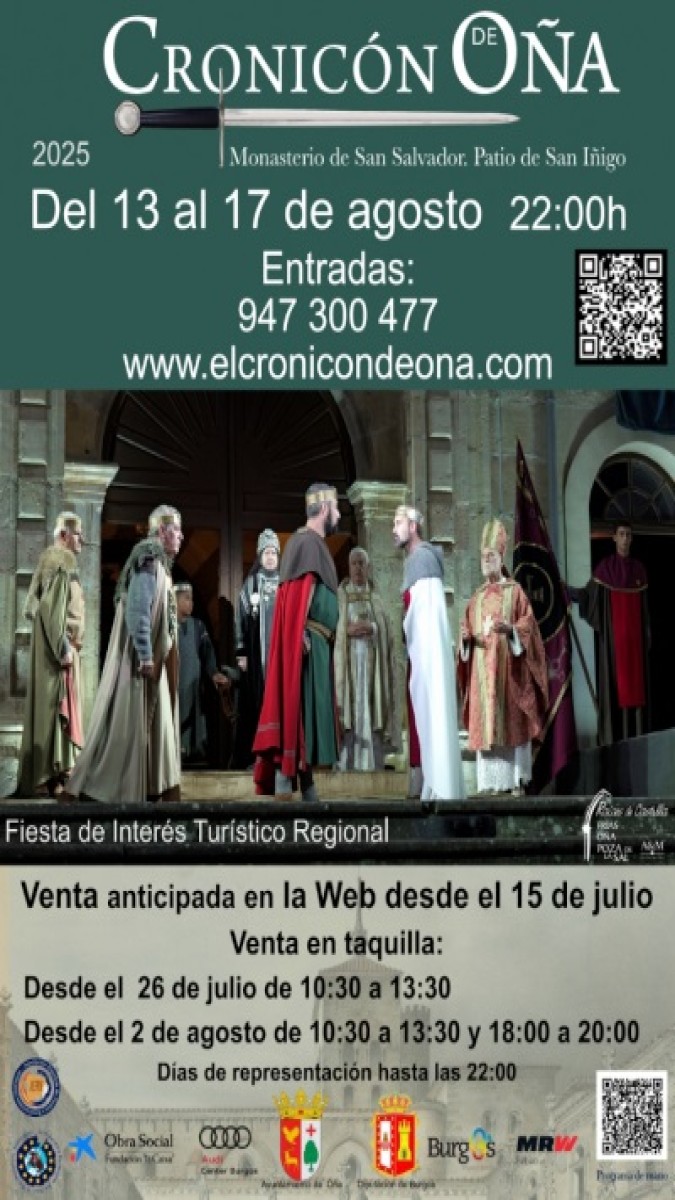 El Cronicón de Oña se representa siempre, durante cinco días, en el fin de semana que va unido al 15 de agosto, festividad de la Asunción. La taquilla se abre unos diez días antes de que empiecen las representaciones y los encargos por teléfono de las entradas se pueden hacer en el mismo periodo.