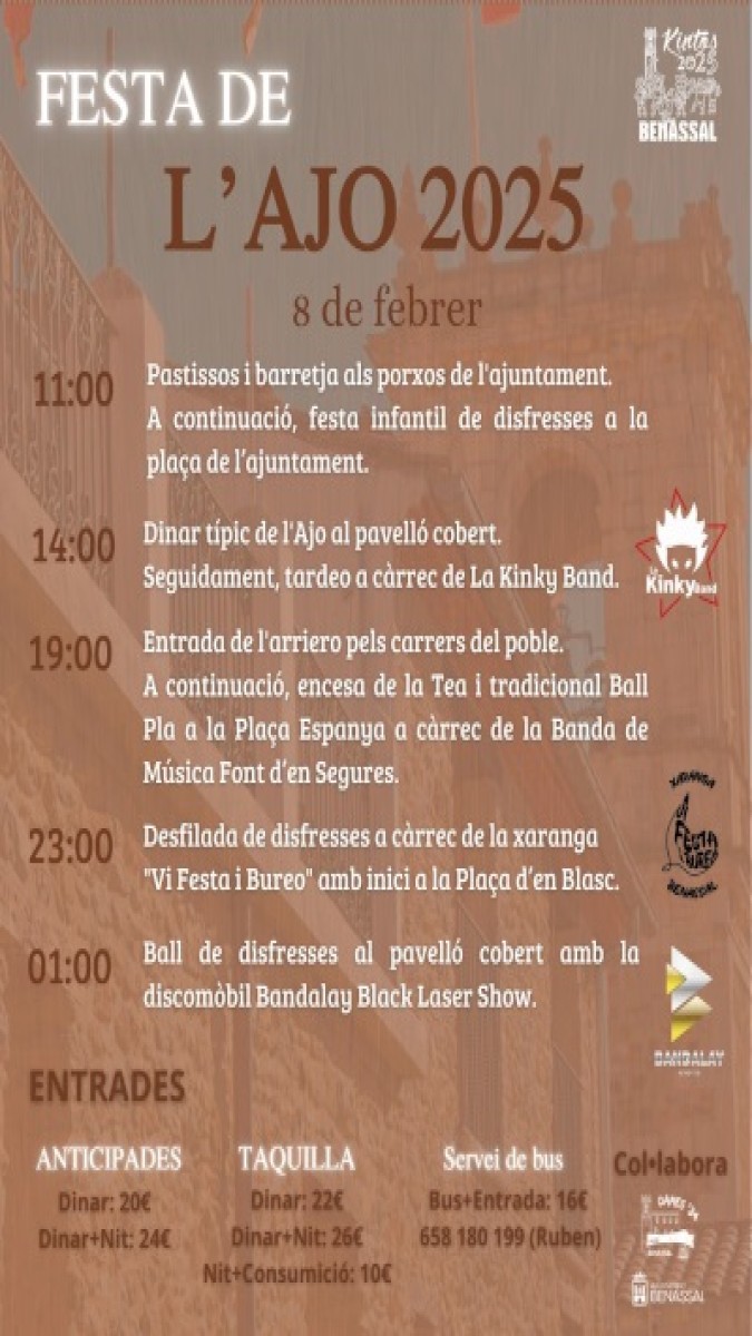 La comida típica de estos 'Carnestoltes' es 'El Ajo', plato sobre el que gira este tradicional evento, motivo por lo que también es conocida como Fiesta del Ajo, y son dos los bailes típicos que se danzan: el que se baila a la luz de la 'tea' (madera de pino) y el baile de disfraces.