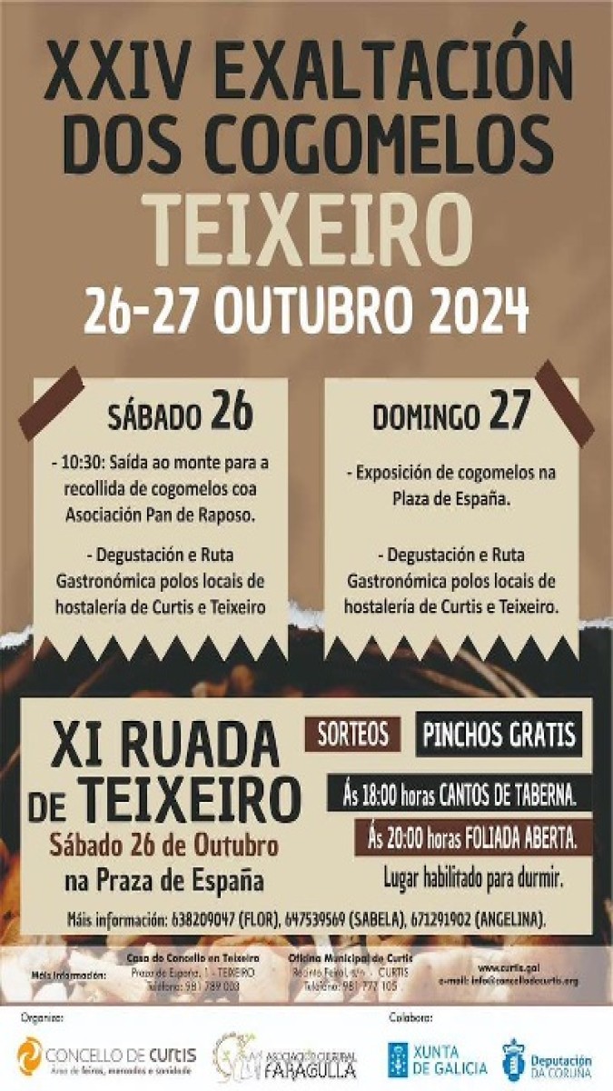 El fin de semana del último domingo de octubre, en Teixeiro, capital del concello coruñés de Curtis, se celebra la 'Exaltación dos Cogomelos' (setas); epicentro, desde 1999, para los aficionados a la micología en el que no falta propuestas gastronómicas, comerciales y culturales.